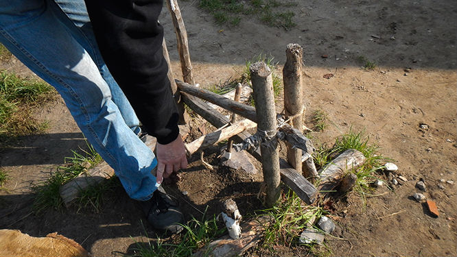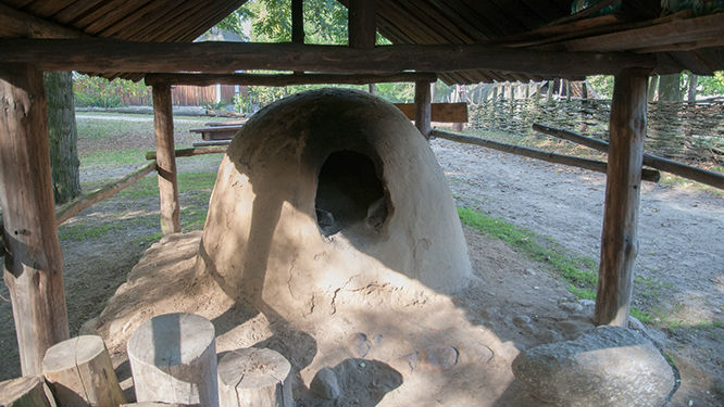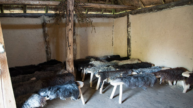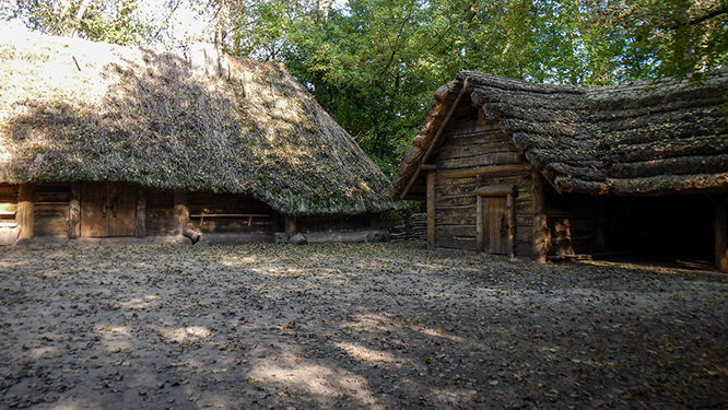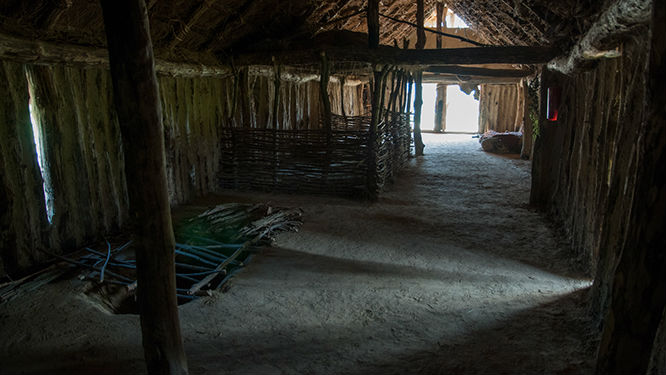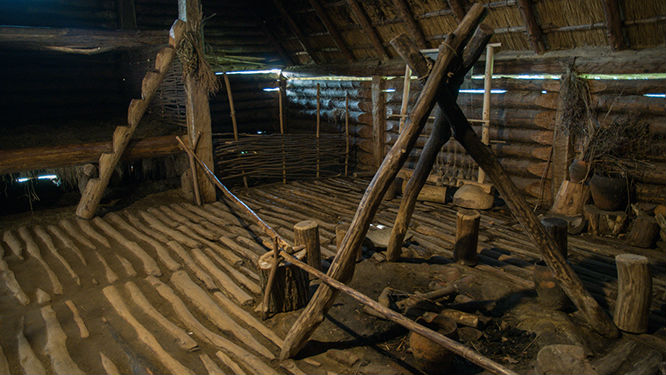 Dziura w ziemi to miejsce na przechowywanie żywności. W tle widać zagrodę dla zwierząt. Szpary w ścianach pełniły funkcję okien. Podobno na zimę były zalepiane gliną żeby utrzymywać wyższą temperaturę w pomieszczeniu.