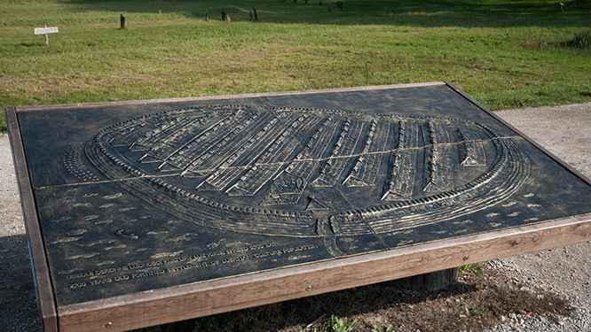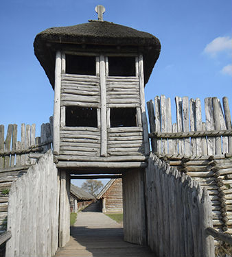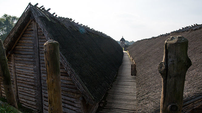 Po wejściu na dziedziniec możemy oglądać dwa zrekonstruowane domy. Oryginalnie za bramą znajdowały się chaty ustawione wzdłuż jedenastu ulic wyłożonych dębowymi balami. W osadzie znajdował się również plac dla mieszkańców.
