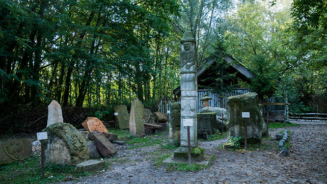Na terenie muzeum znajduje się też niewielki zbiór obelisków i totemów.