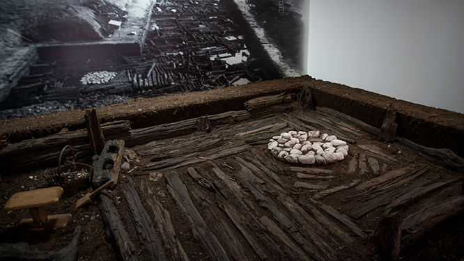 Autentyczny fragment podłogi jednej z chat. Białe kamienie służyły jako podkład pod palenisko.